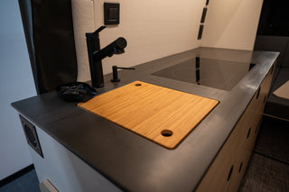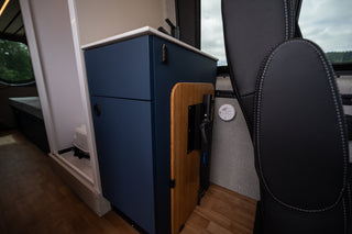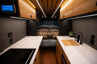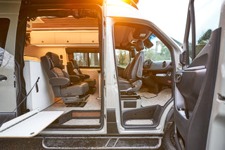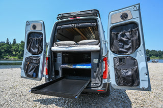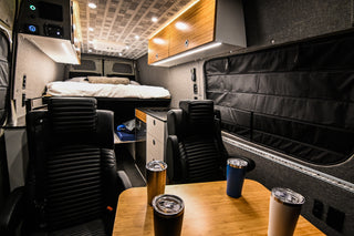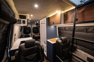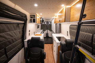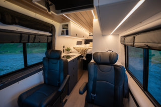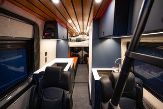 The Mazama is our most modular layout; with a removable upper bunk, so you can seat 10 in your van; removable lower stringer so you can transport your bikes inside; removable seats if you want a little extra mobility when the kids are gone; and a hidden toilet compartment that can be used for storage.