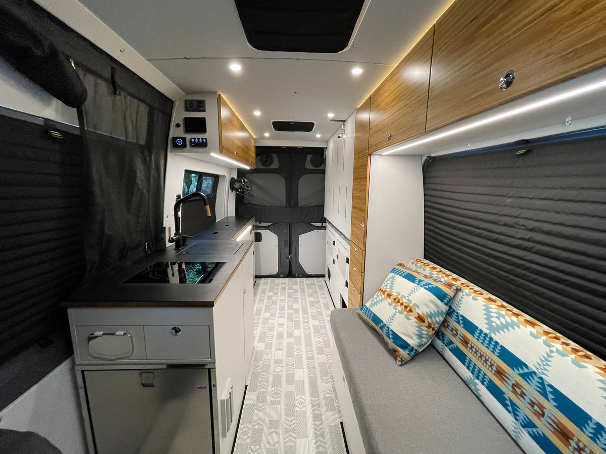 This marketing van for Inhabit Designs can be found at all the shows across the US. The beauty of this neutral color scheme is that he can change the floor mats, couch slipcovers, and bedding and it feels like a completely different van in a matter of minutes!