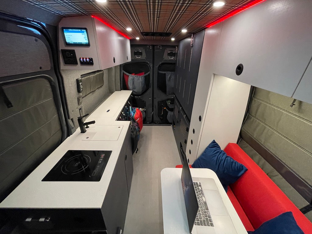 The Rainier Layout is by far our most popular model and it's easy to see why. With a built-in toilet, shower, queen-size bed, 8 feet of counter, and 50 cubic feet of garage space while still retaining a super open feeling inside, we really checked all the boxes. Plus with a custom-printed ceiling, you can make it as unique as your next adventure!
