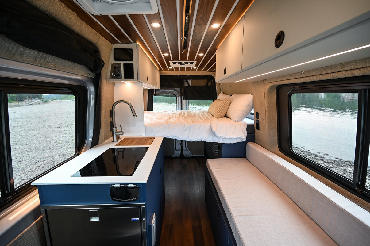 This semi-custom Rainier buildout has the Snowbound color scheme with a custom bench long enough to sleep a second person utilizing a lee-cloth that pays homage to a sailboat. The homey, yet rugged feel makes this van feel like home whether you're out at the beach or using it as an extra bedroom at Thanksgiving.
