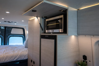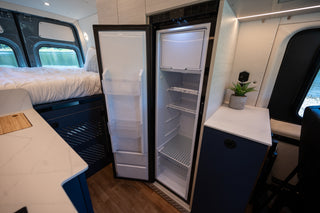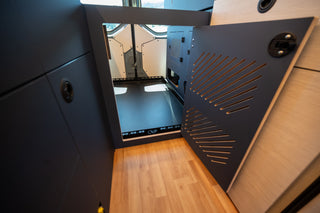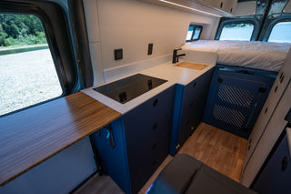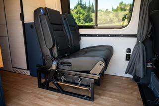 This Shasta layout is perfect for a family with one child and the ability to bring a friend or cousin. The Scopema seat folds forward into a bed combined with the driver's seat. This van also has a murphy bed sleeping widthwise with flarespace flares to free up more interior space.