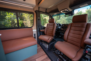 The Mazama is our most modular layout; with a removable upper bunk, so you can seat 10 in your van; removable lower stringer so you can transport your bikes inside; removable seats if you want a little extra mobility when the kids are gone; and a hidden toilet compartment that can be used for storage if you don't need the loo.