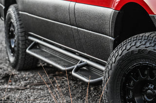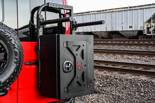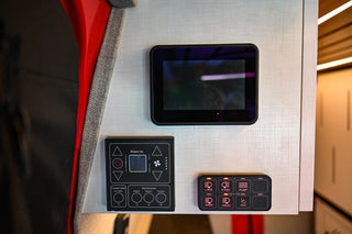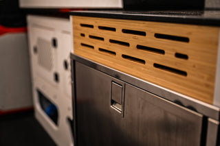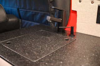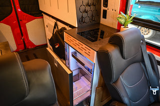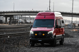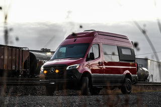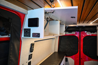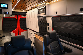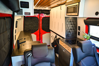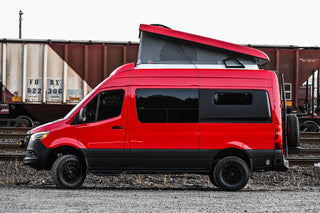 This totally EPIC Thielsen buildout is honestly a piece of art. Not only can you safely seat 4 people in DOT-rated seats, but you can also sleep 4 in one queen-size murphy bed and 1 full-size bed in the SCA pop-top. The rocker panels, flares, and rear backwoods bumper were all Line-X'ed for extra scratch resistance when taking it down those forest roads. The pop-top was paint-matched red to match the rest of this beautiful rig to complete the look.