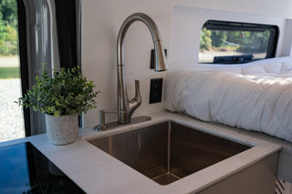 Bright and airy layout with lots of storage and plenty of space to lounge. Built on the Ford Transit Trail Chassis so its quick off the line and easier to find fuel, especially in California!